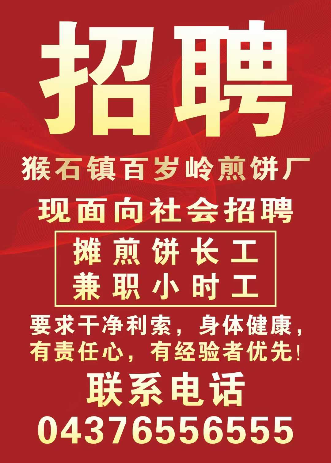 猴石鎮(zhèn)百歲嶺煎餅廠現(xiàn)面向社會招聘工人。要求:干凈利索、身體健康,有責(zé)任心。有經(jīng)驗者優(yōu)先。