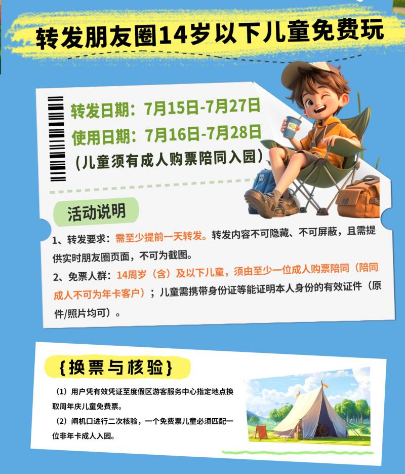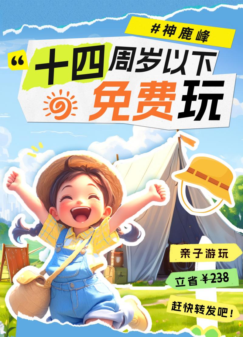 神鹿峰景區14歲以下兒童免費玩啦!轉發朋友圈立省238元,7月16-28日可用。兒童需有成人陪同入園,成人票正常購買即可。搜索神鹿峰公眾號,活動期間需提前一天轉發朋友圈,截圖無效哦。